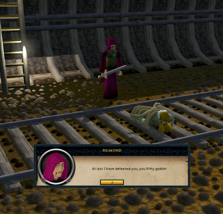 Meanwhile, Sigmund, feeling that H.A.M needs to take a more active approach to stopping the cave goblins, formed a splinter group and kidnapped a goblin known as Grubfoot, and took him to their new base located in the Flour Mill north of Ardougne in an attempt to interrogate him in the effort to find out what the cave goblins are up to. He was then rescued by the adventurer, and Zanik, who had been possessed by Bandos at the time, appeared with an army of goblins to kill the H.A.M. members. She confronted and killed Sigmund, while the other H.A.M. members were killed by her army of goblins. Zanik (under Bandos' control) then turned her crossbow on the adventurer, but they were able to convince Zanik to take off Bandos's pendant, restoring her normal self. However, the goblin High Priest picked up the pendant and was instantly possessed by Bandos just like Zanik was. He then proceeded to destroy the base, while the adventurer and Zanik teleported away.