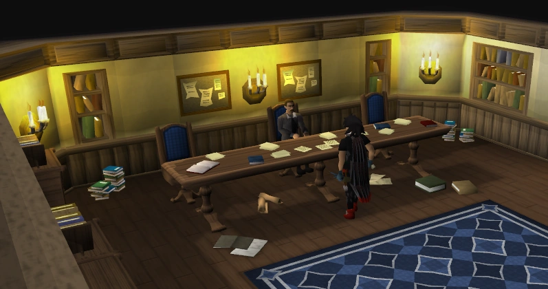 The player would find themselves in a disorganised office next to Giles, Miles or Niles who would show the player a noted item. If the player correctly identified the item from three different choices, he or she would be allowed to leave through the exit portal, receiving a Random Event gift on their return to their original location. If not, the player would have their inventory noted and be teleported to a random location instead. Interestingly, the office bears a resemblance in shape and layout to the Grim Reaper's office that was visited upon a players first death before Soul Reaper was released.